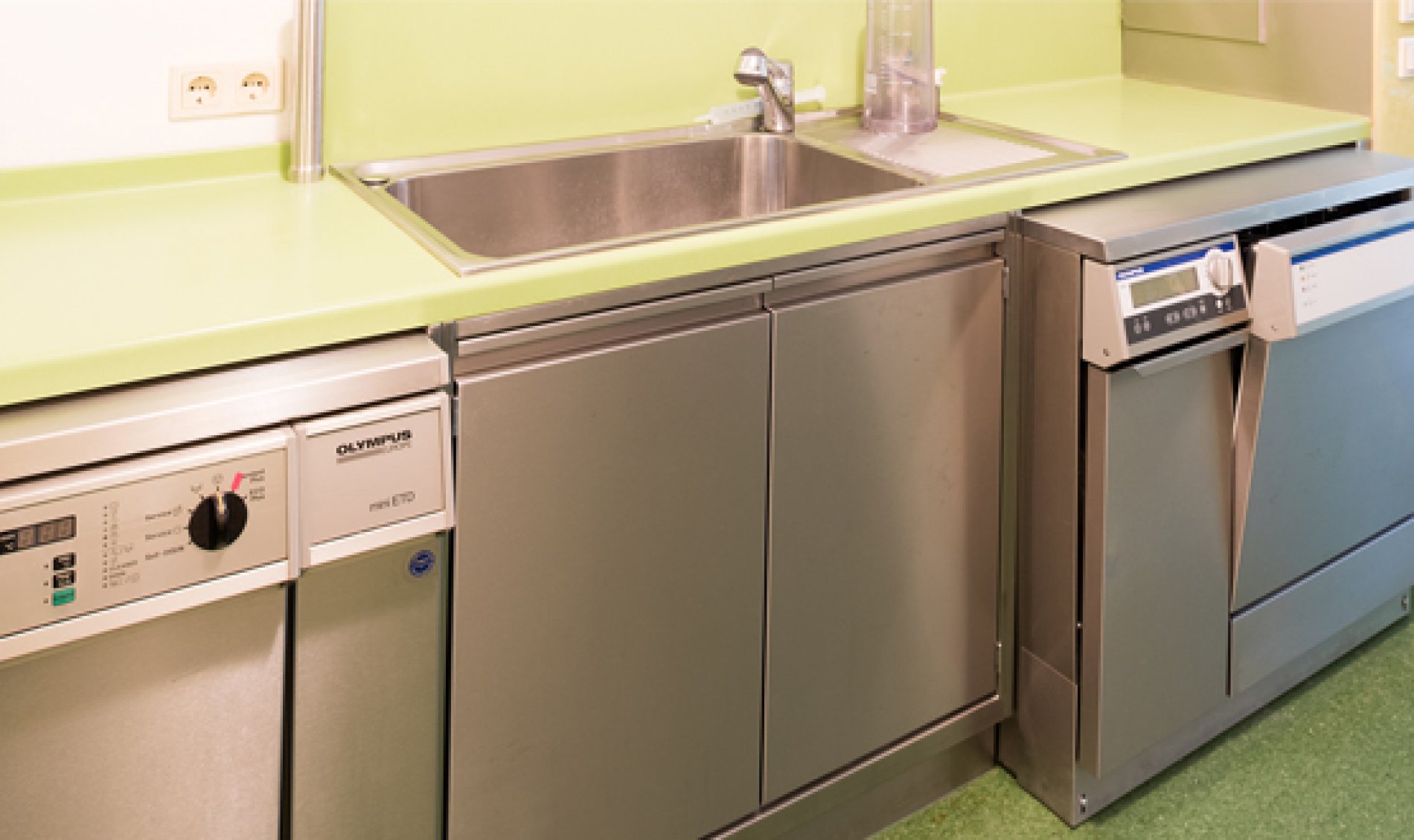 Im Jahre 2011 wurde der Endoskopiebereich der Praxis Dr. Wollein bereits gemeinsam mit der Firma METAGRO umgebaut. Damals galt es, die kniffelige Anforderung zu lösen, die Endoskopiewaschmaschinen so in die Edelstahlmöbel zu integrieren, dass sie für Servicearbeiten auch ausgezogen werden können. 2015 folgte dann der Umbau des Untersuchungs- und Eingriffsraumes. In der Praxis werden Magenspielgelungen, aber auch kleinere ambulante Operationen durchgeführt. War der Endoskopiebereich in der Farbe Grün gelöst, so ist dieser auch für Patienten vorgesehene Bereich in freundlichem, sattem Gelb gestaltet - eine wohltuende Kombination zu der Kühle und Hygienekompetenz des Edelstahls. Eine gelbe Corian-Platte mit fugenlosen Wandhochzügen und über drei Metern Länge sowie einem Meter Höhe fungiert somit als freundlicher Blickfänger und beruhigendes Gestaltungselement. Das Besondere an dem Projekt sind vor allem die individuellen, maßgefertigten Möbel mit Sonderbreiten und -höhen der Laden und eine spezielle Befestigungsmöglichkeit für einen bauseitigen Safe.