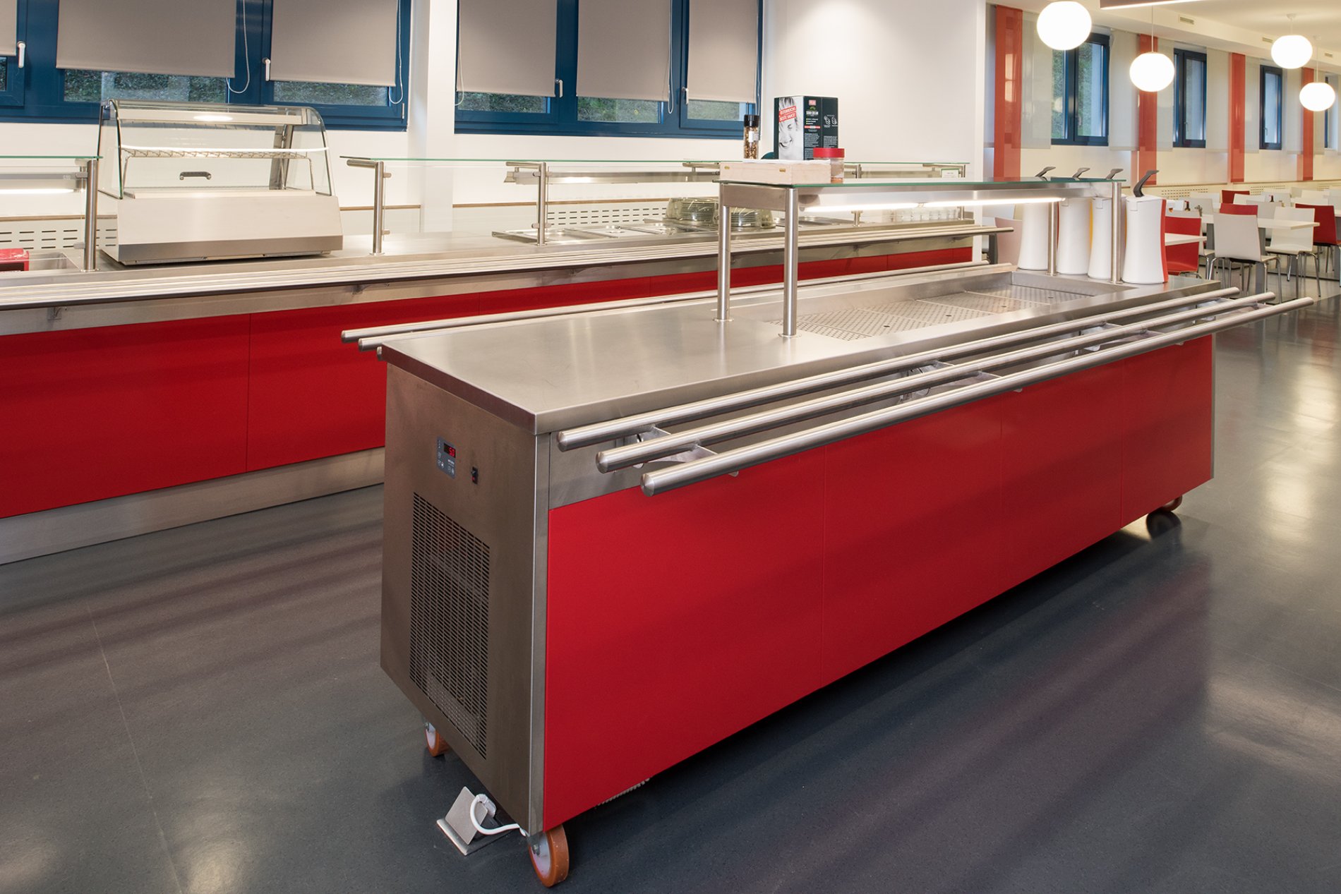Gerade bei Speiseverteilsystemen ist eine hohe Leistungsfähigkeit und Flexibilität gefordert. Die Essensausgabezeiten sind auf wenige Stunden konzentriert und erfordern daher einen reibungslosen Ablauf. Gemeinsam mit unseren Kunden entwickeln wir die optimale Lösung für diese hohen Ansprüche. So gibt es Glasaufsätze mit Wärmestrahler und Beleuchtung oder Tablettrutschen über Eck (sowohl in gekanteter Ausführung als auch in verschweißter Rundrohrausführung.