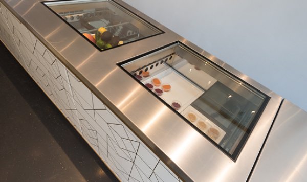 es zubereitet wird. Deswegen habe ich mich für eine offene Küche entschieden. Das offene Design ermöglicht es den Kunden,