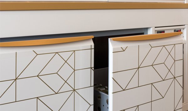 Weiß-Gold beschichten. Anschließend haben wir einen Teil der Fronten mit dem Muster, in Form einer Folie, beklebt.