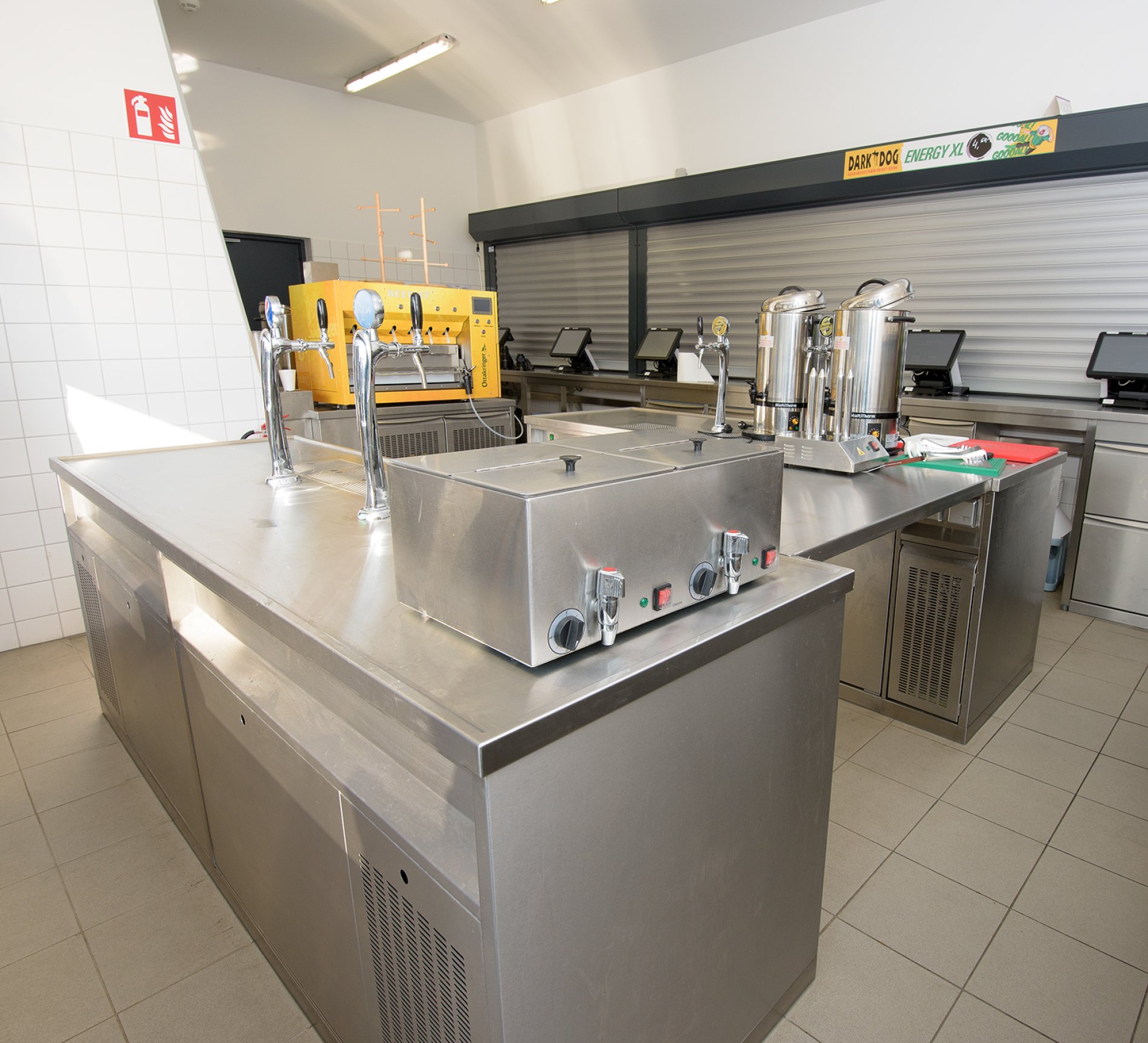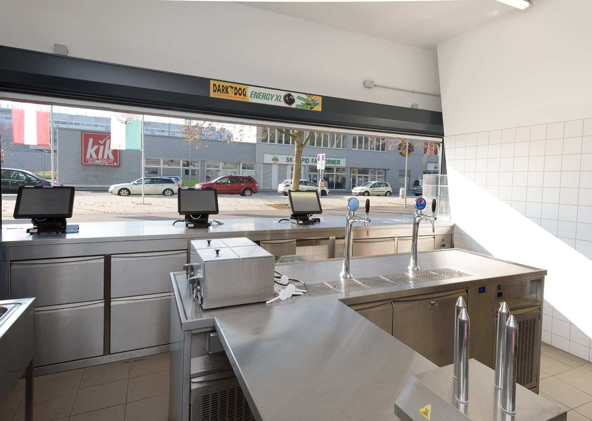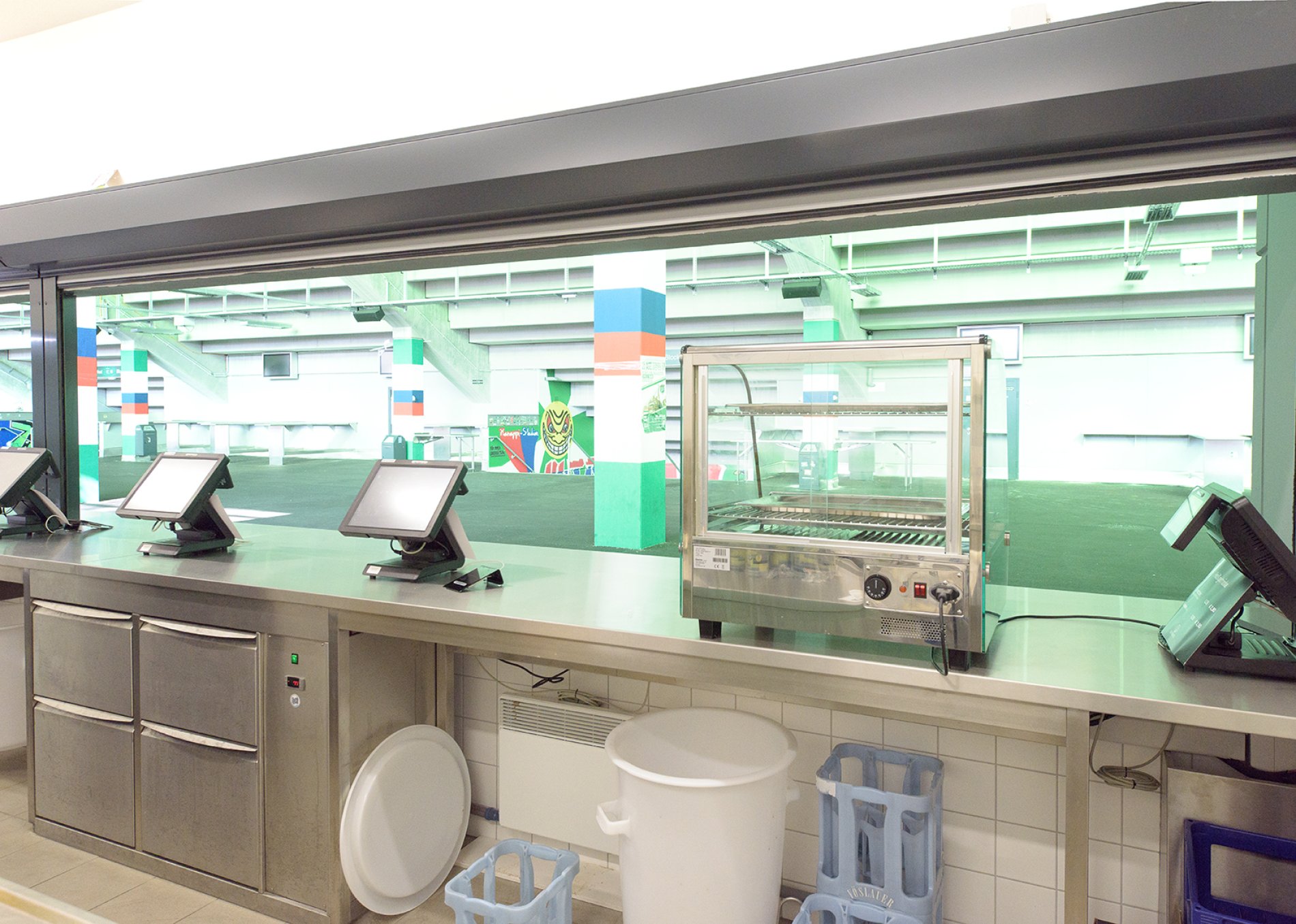 Fußballfans dürfen sich neben verbesserten Sicherheitsstandards auf modernen Stadionkomfort freuen. Im Nord-, Süd- und Ostteil des Stadions wurden 24 sogenannte „Kioske“ plaziert, die mit Kühl- und Zapfmöbeln sowie Sonderkühlmöbeln von METAGRO ausgestattet worden sind. Auch die Ausgabemöbel sowie die Spültische stammen aus dem Hainfelder Unternehmen. Die Abstellborde für die Fans wurden aus besonders dicken 3mm-Blechen komplett in Edelstahl gefertigt. Es wurde die sonst übliche Spanplattenunterfütterung komplett durch Edelstahl ersetzt.