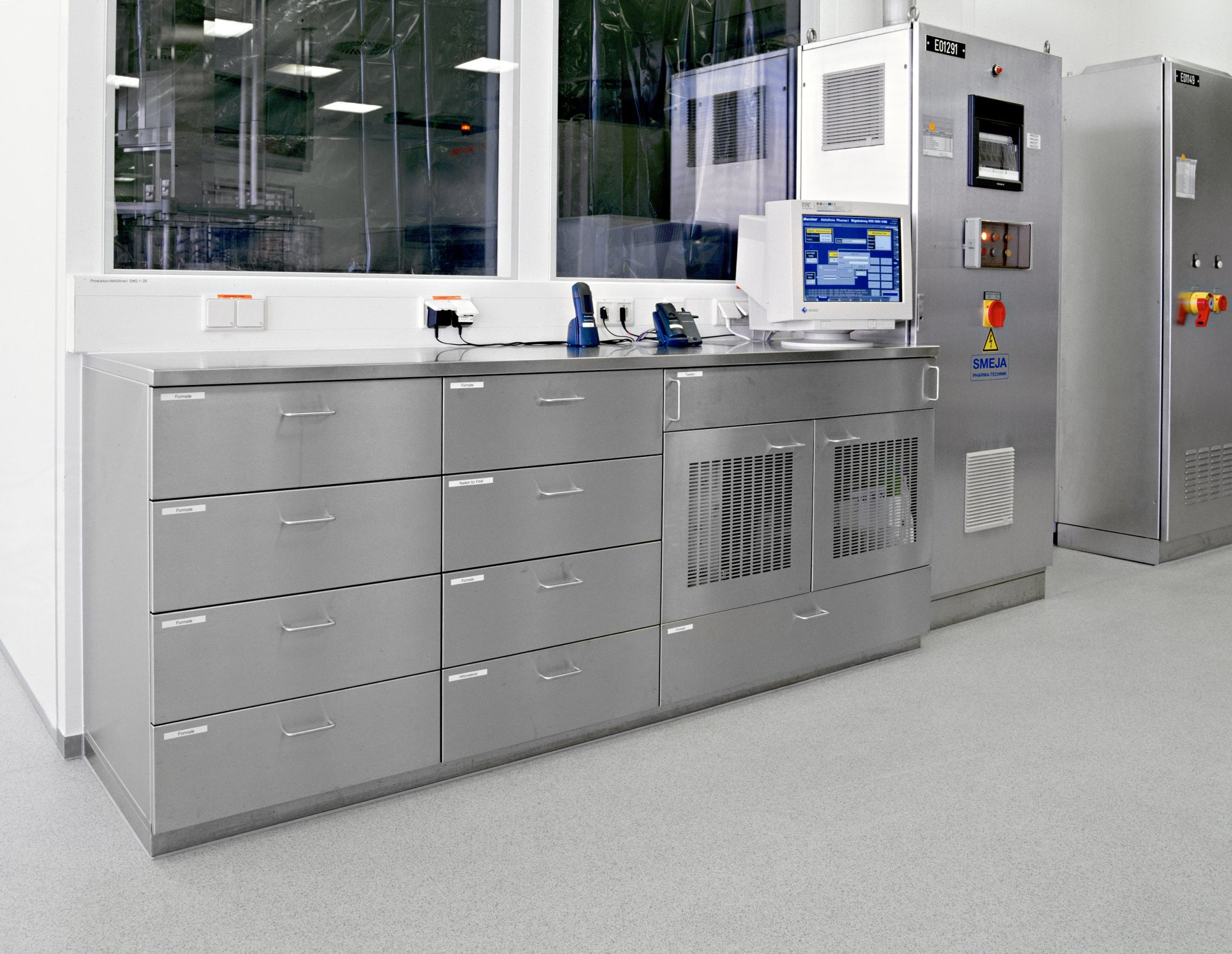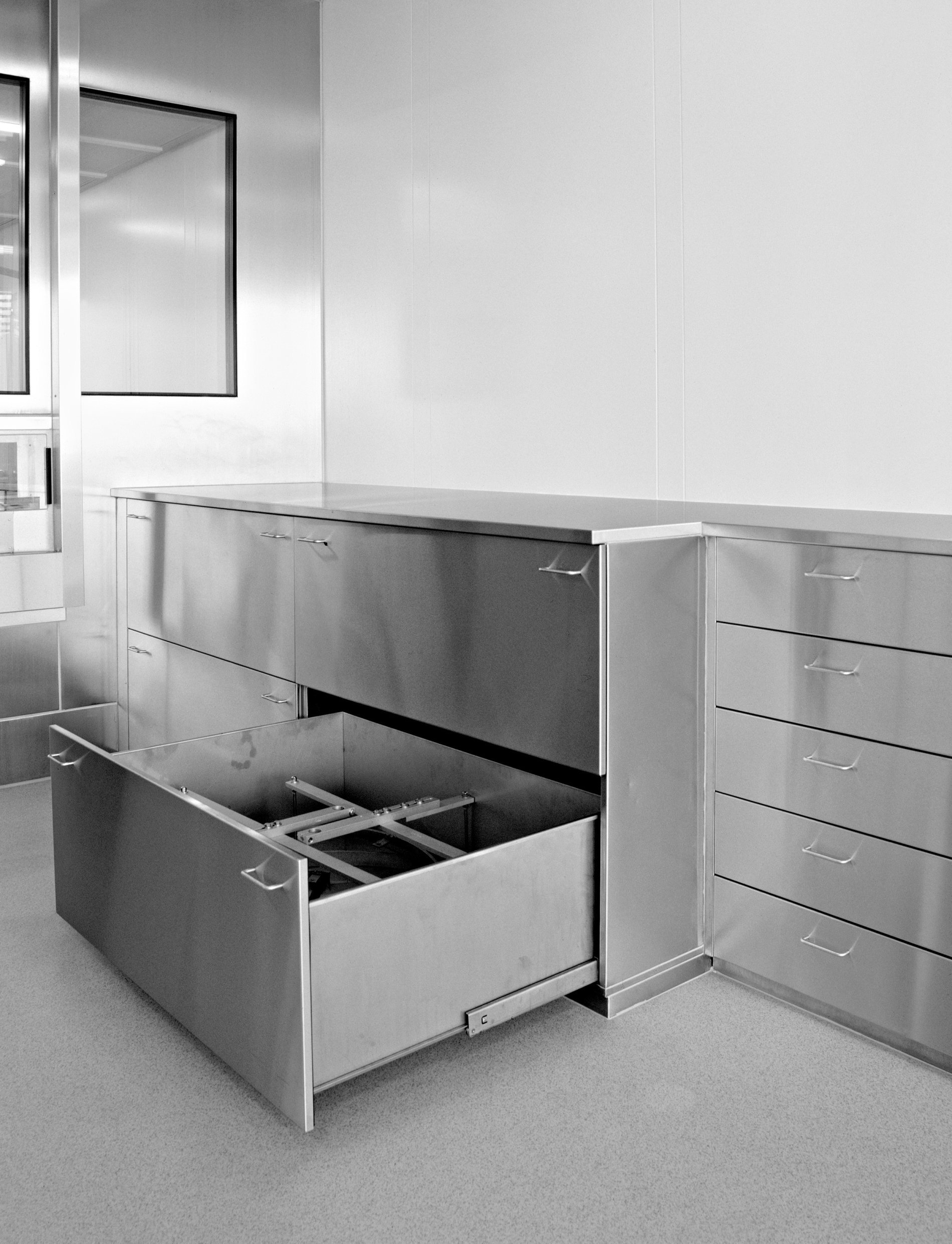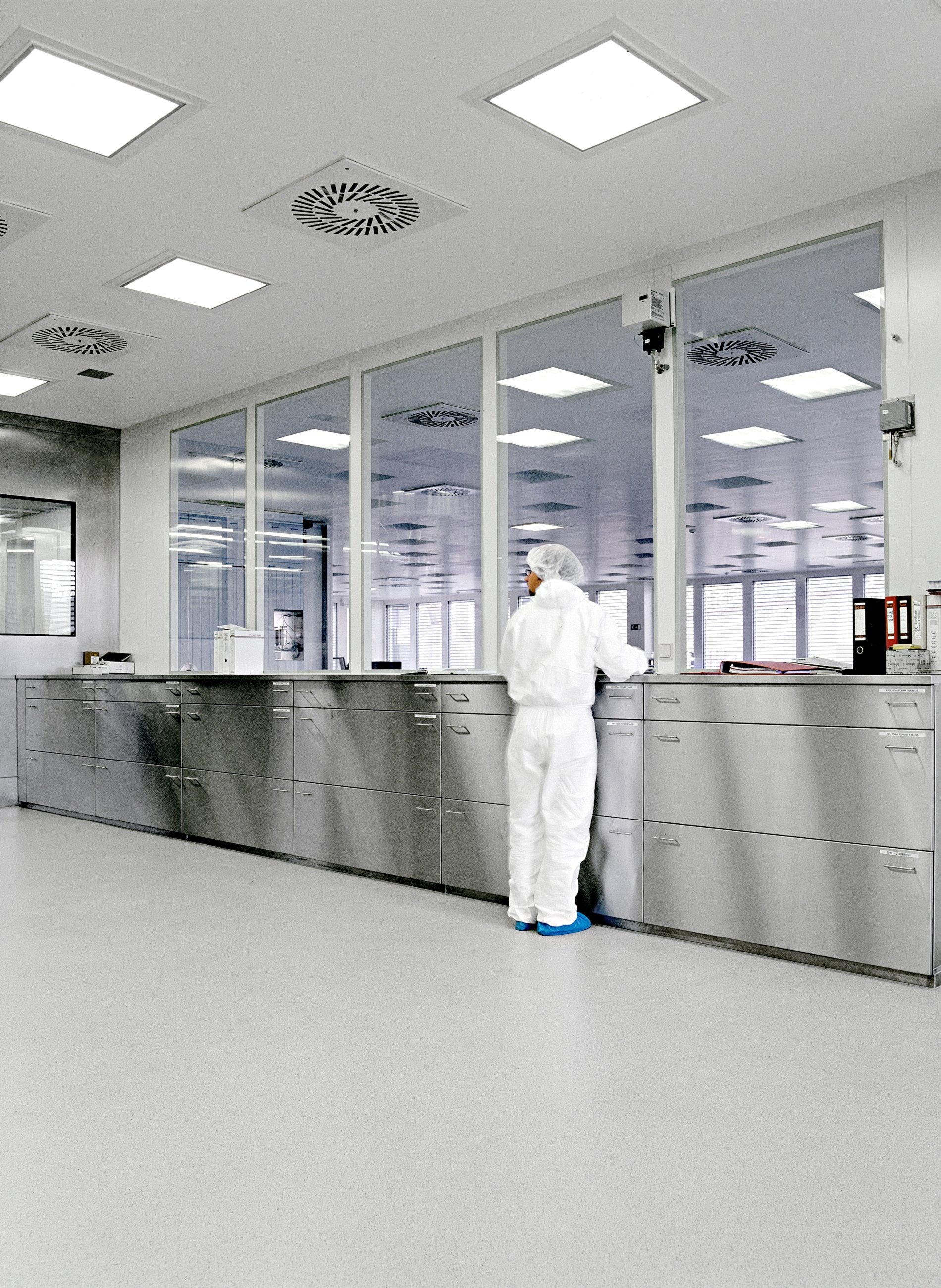 Die Spezialisten von METAGRO planen, fertigen und liefern seit vielen Jahren professionelle Lösungen für Baxter. Denn bei der Arbeit im Labor hat Hygiene oberste Priorität. Dies war auch die Anforderung an die Möbel für den Labor- und den Medikamentenproduktionsbereich. Die Größen der Laden wurden an die Maschinenkomponenten angepasst. Je nach Abteilung sind dann Bügelgriffe oder versenkte Griffleisten montiert worden. Im Laborbereich wurde eine Arbeitsplatte aus Corian gewählt. Alle Möbel wurden millimetergenau angepasst.