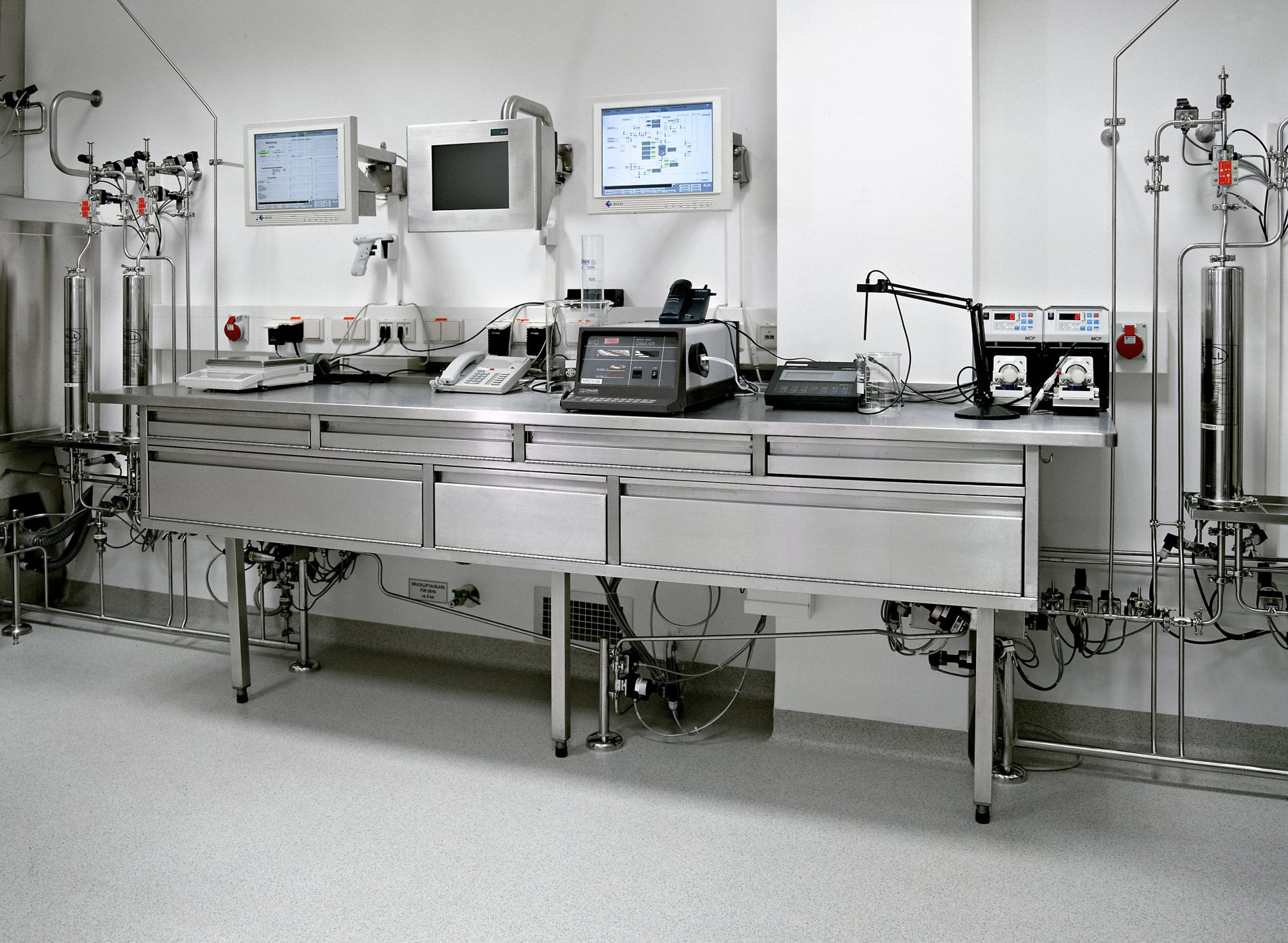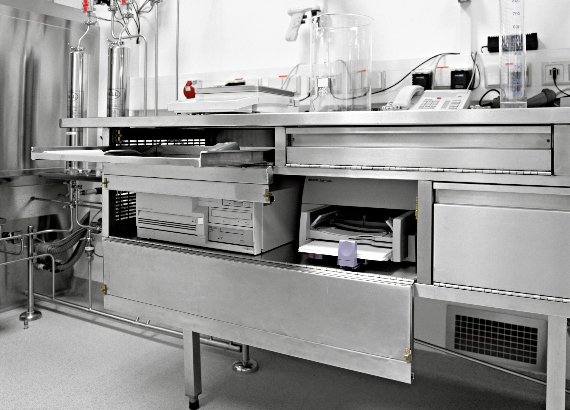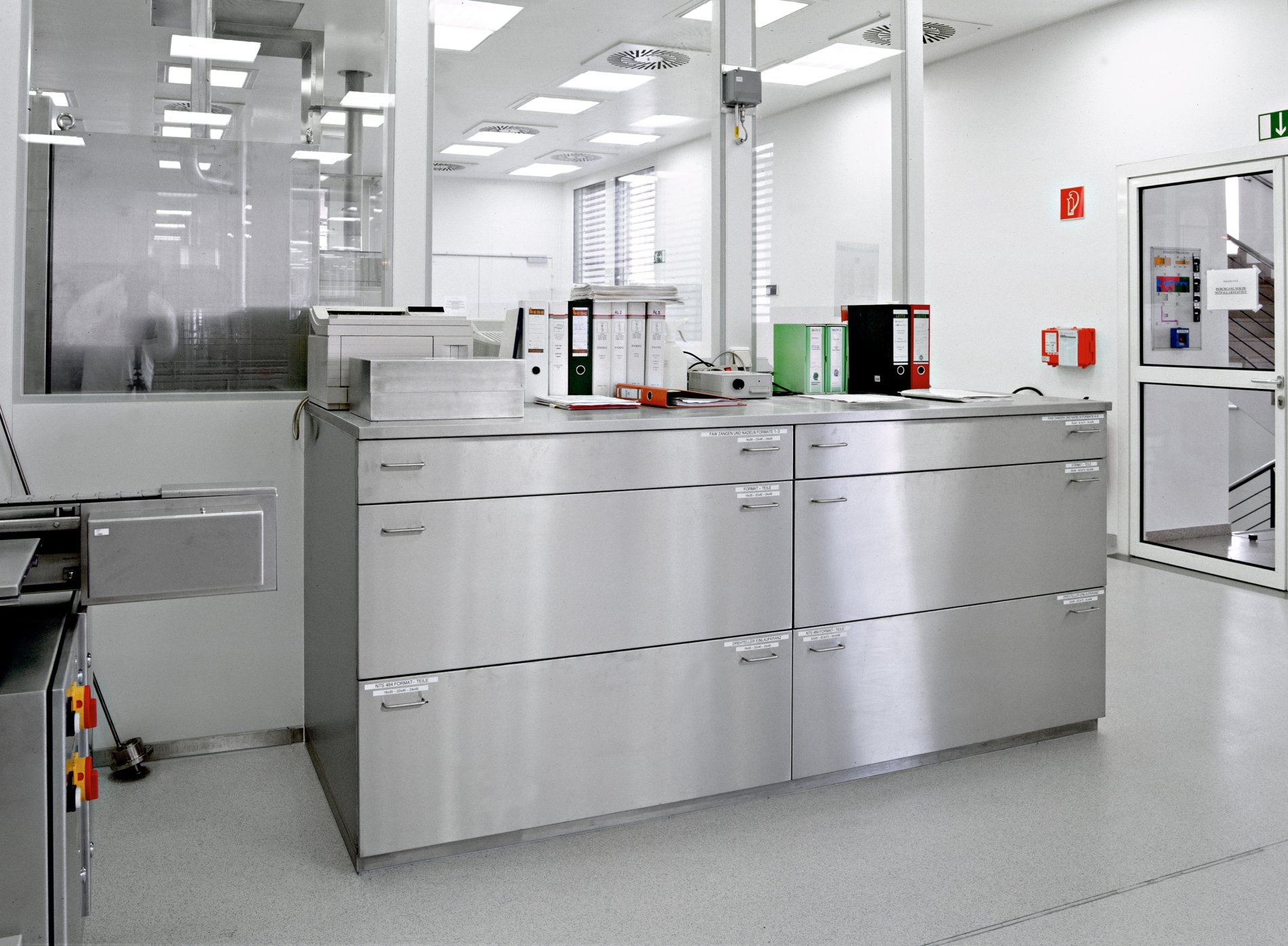 Die Spezialisten von METAGRO planen, fertigen und liefern seit vielen Jahren professionelle Lösungen für Baxter. Denn bei der Arbeit im Labor hat Hygiene oberste Priorität. Dies war auch die Anforderung an die Möbel für den Labor- und den Medikamentenproduktionsbereich. Die Größen der Laden wurden an die Maschinenkomponenten angepasst. Je nach Abteilung sind dann Bügelgriffe oder versenkte Griffleisten montiert worden. Im Laborbereich wurde eine Arbeitsplatte aus Corian gewählt. Alle Möbel wurden millimetergenau angepasst.